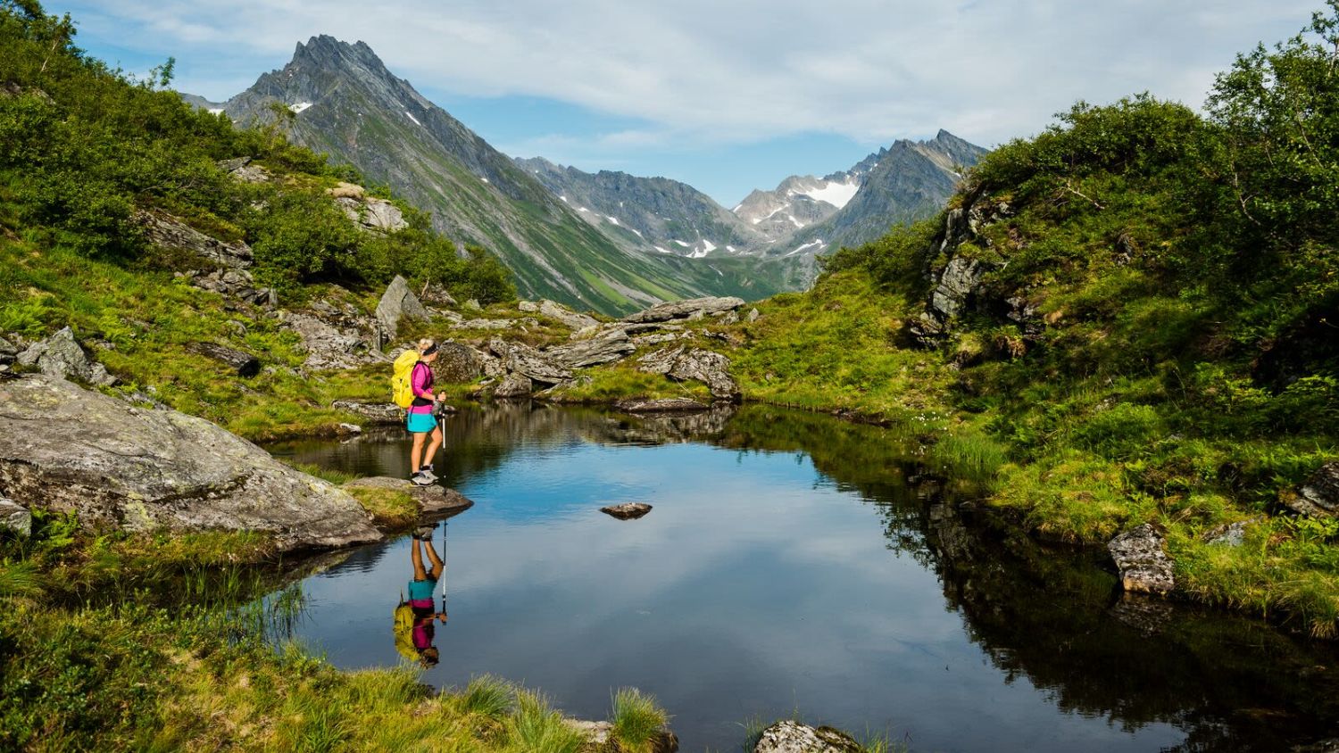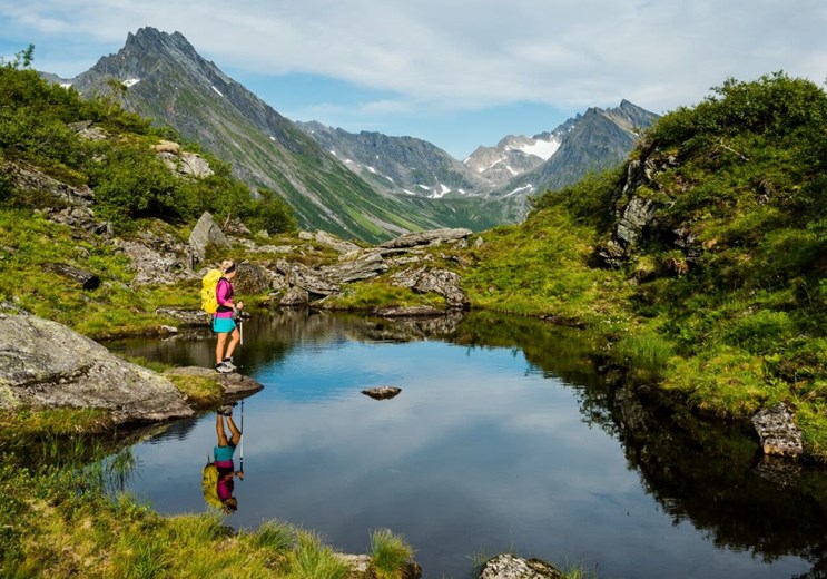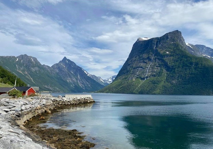 Højt til fjelds, frisk luft, og en larmende stilhed. En skøn og lidt udfordrende fjeldvandring ved den uberørte og storslåede Hjørundfjord. Nyd en tur omgivet at høje bjergtinder, i dybe dale og besøg på en gammel sæter med traditioner.landskab med fantastisk udsigt over fjorden.