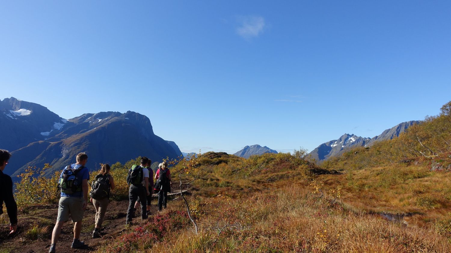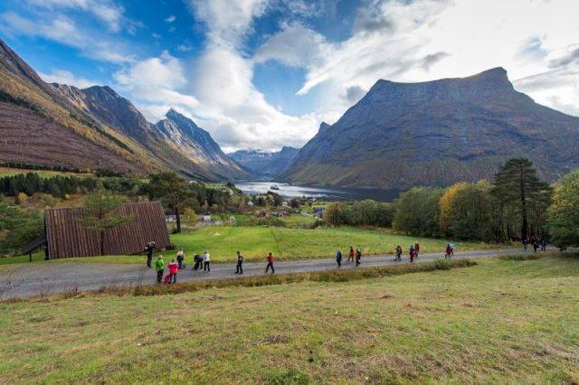 NIVEAU 3. Tag med på en 6 km lang vandretur i fjeldene ved Hjørundfjorden. Nyd de storslåede udsigter over fjorden og det smukke landskab. Stigningen 220 højdemeter mod toppen er stejl, og de sidste 500 meter er løse småsten (urer) så du skal have gode sko på. På vandreturen besøger vi 2 af sæterne. I gamle dage blev folk og kvæg sendt på sommerophold. Fjeldengene skulle bruges til at fede køerne op og kvinderne bar mælken tilbage til gårdene ved fjorden. Send dem en tanke når vi går samme tur tilbage, dog uden den tunge mælk på skulderen!. Inden turen går ned igen er der kaffepause og udsigt over Hjørundfjordens fjordarm og alpine tinder.