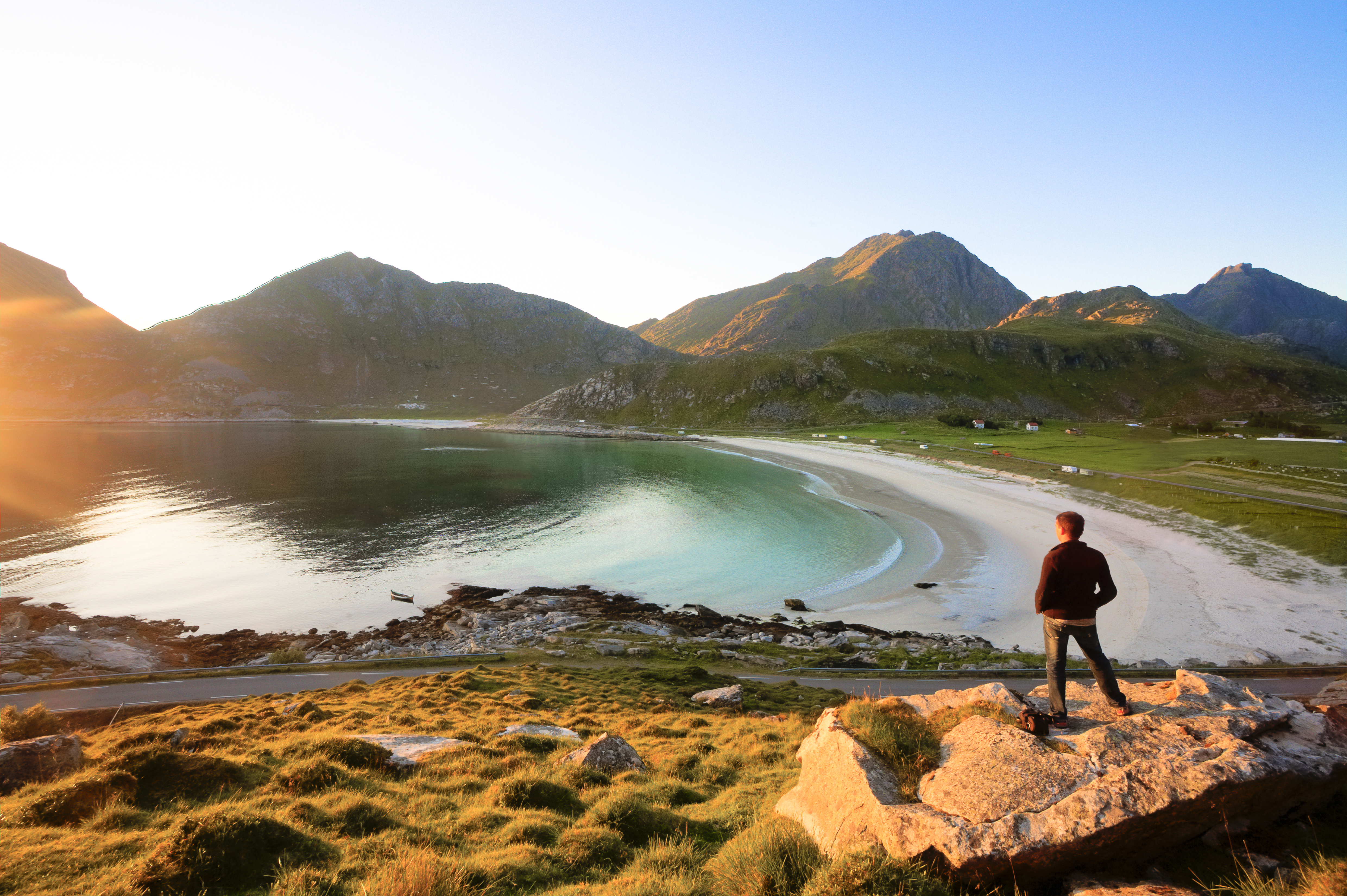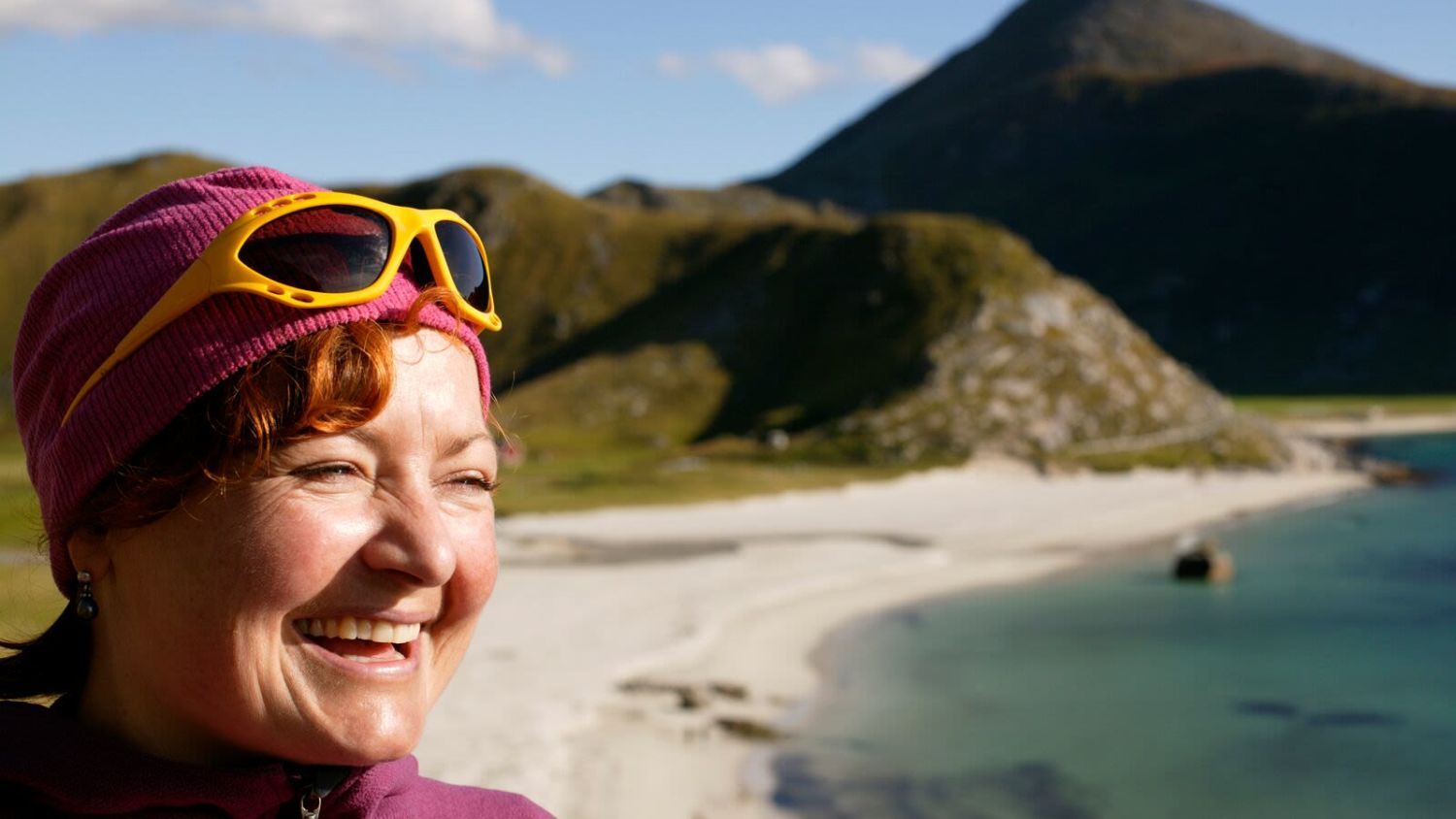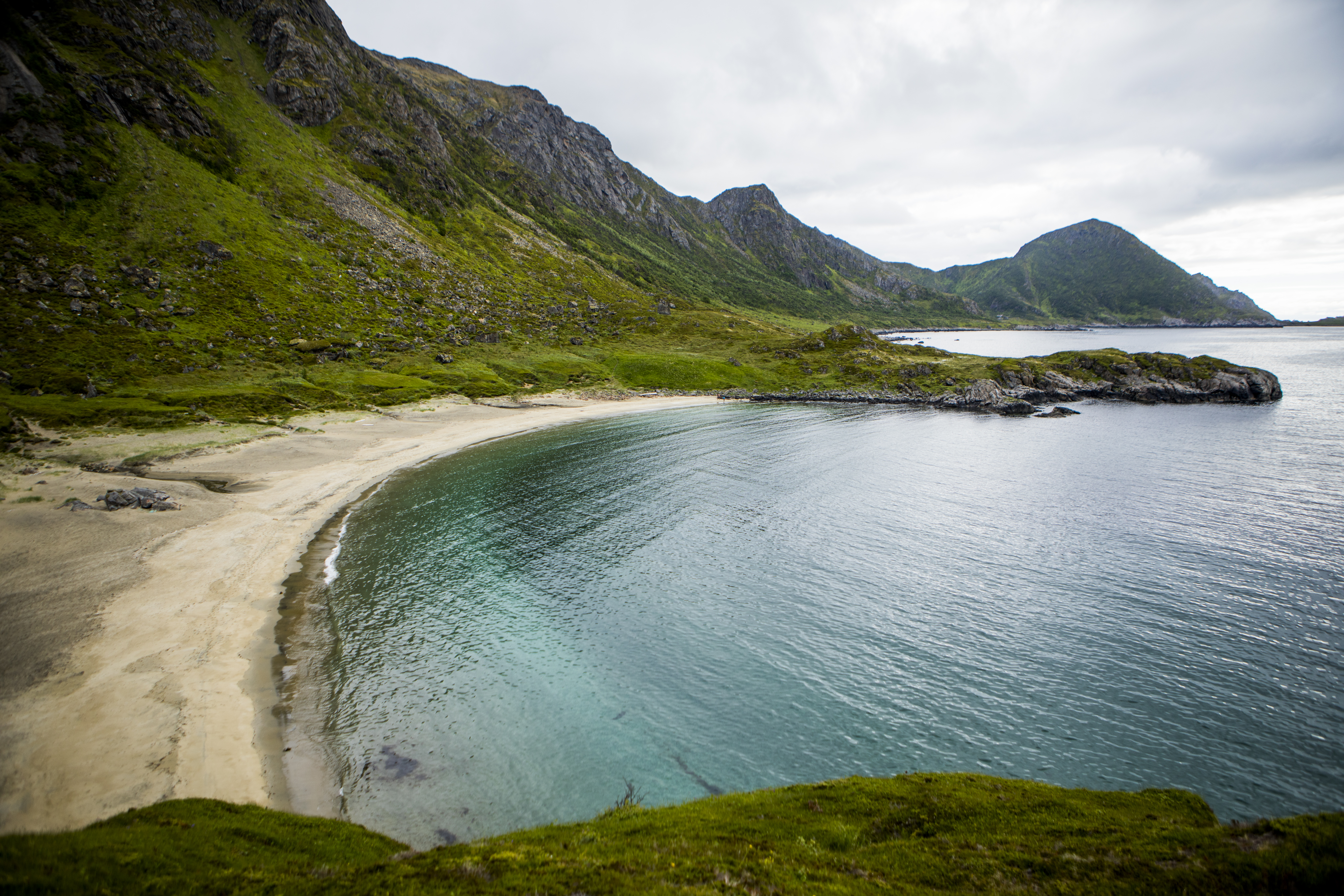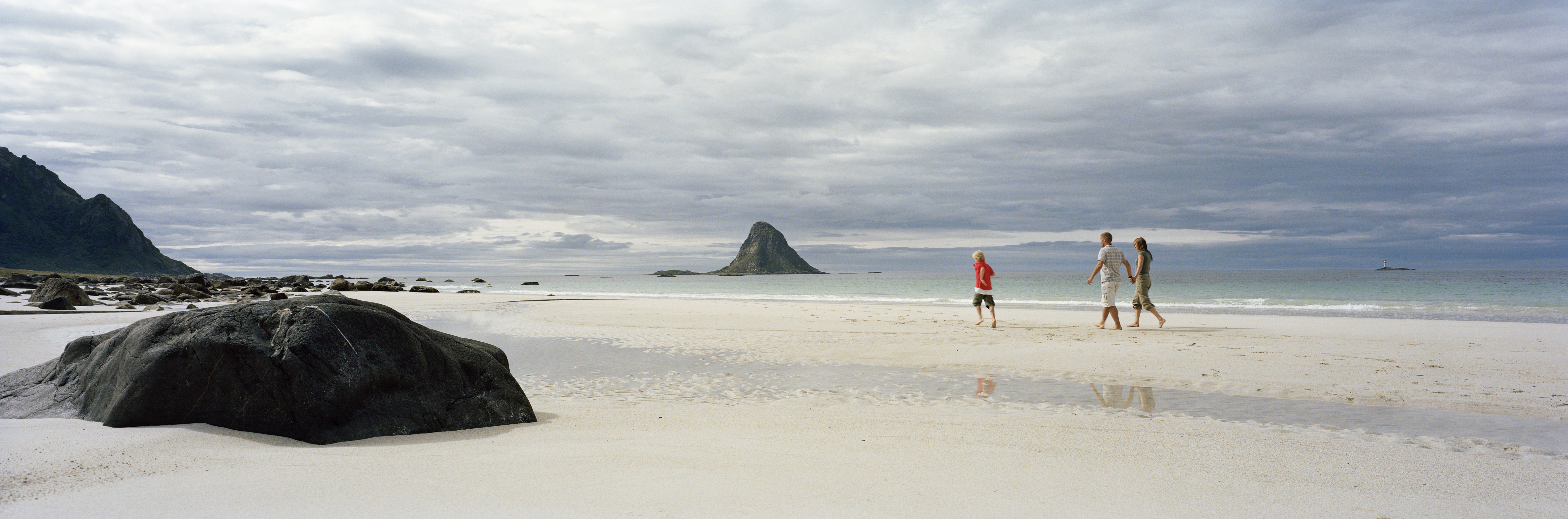 NIVEAU 2. Tag med på en vandretur med ikoniske udsigter. Kridhvidt sand, irgrønne marker og det turkisblå vand - alt under Lofotens vilde fjelde. På denne tur går vi op over et lavt fjeldpas mellem de to strande og nyder den betagende udsigt i alle retninger.