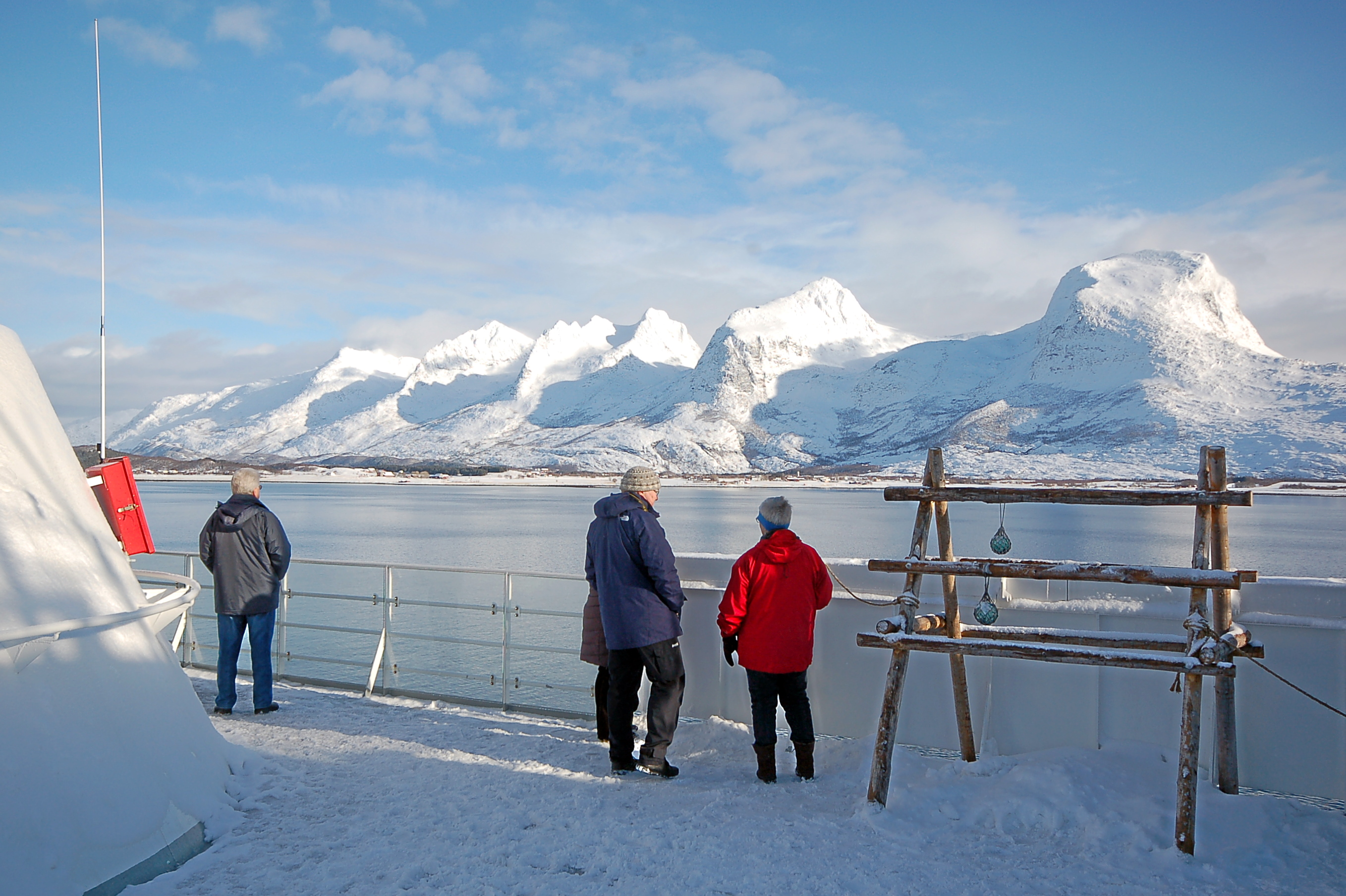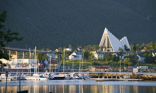 Stokmarknes - Skjervøy. På vores tur mod Tromsø, kan den pragtfulde natur nydes fra dækket. Undervejs er der korte stop i Risøyhamn, Harstad og Finnsnes. Om eftermiddagen er der ankomst til Tromsø - porten til arktisk. I den arktiske hovedstad skinner midnatssolen fra slut maj til sidste uge i juli. Tromsø omtales ofte som Nordens Paris og byens kendteste vartegn er Ishavskatedralen. Om vinteren indbyder det frosne landskab til spændende ture som hundeslæde, sneskoture m.m. Fra sept.-marts sætter jagten på nordlyset ind og mens vi fortsætter nordover mod Skjervøy, håber vi på et glimt af det magiske Aurora Borealis.