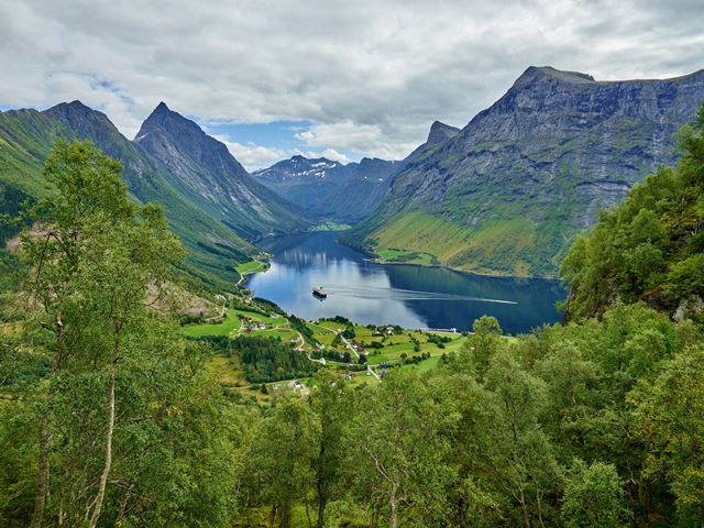 Florø - Molde. Stå tidligt op og se Hornelen (860 m.o.h.), nyd stilheden i fjordene og landskabet vi passere. Efter at har krydset det åbne hav, navigerer skibet i den tidlige morgenstund mellem skær og øer til jugendstilperlen Ålesund. Fra 2/6-1/9 sejles ind i Norges kronjuvel, den overdådig smukke Geirangerfjord som står på UNESCOs verdensarvsliste. Herefter går rejsen videre mod Molde, også kendt som Rosernes by. I perioden 2/9-1/11 udforskes den smukke, storslået Hjørundfjord og de smukkeste fjeldområder.
