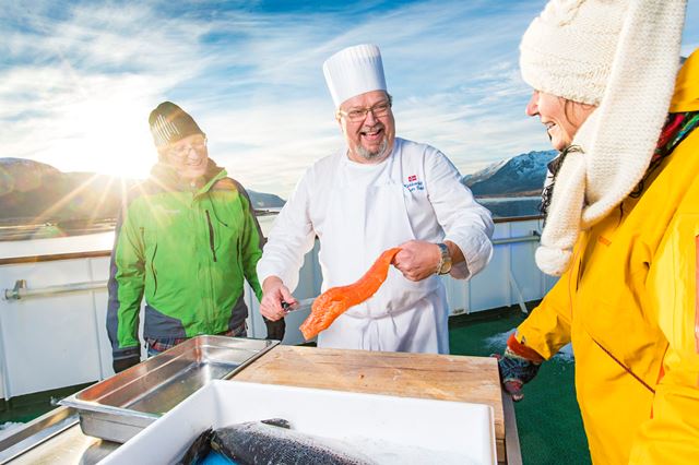 Rejsen begynder i Bergen, hvor Hurtigruten lægger fra kaj om aftenen og sejler nordpå langs Hjeltefjord, ruten som vikingerne fulgte til Shetlandsøerne og videre. Deltag i velkomstmødet, lær dine medpassagerer at kende og få masser af nyttige informationer til din rejse mod det høje nord. Forkæl smagsløgnen fra middagsbuffeten, lavet af friske kystvarer. Nyd den norske vestkyst i aftenmørket som vi sejler forbi.
