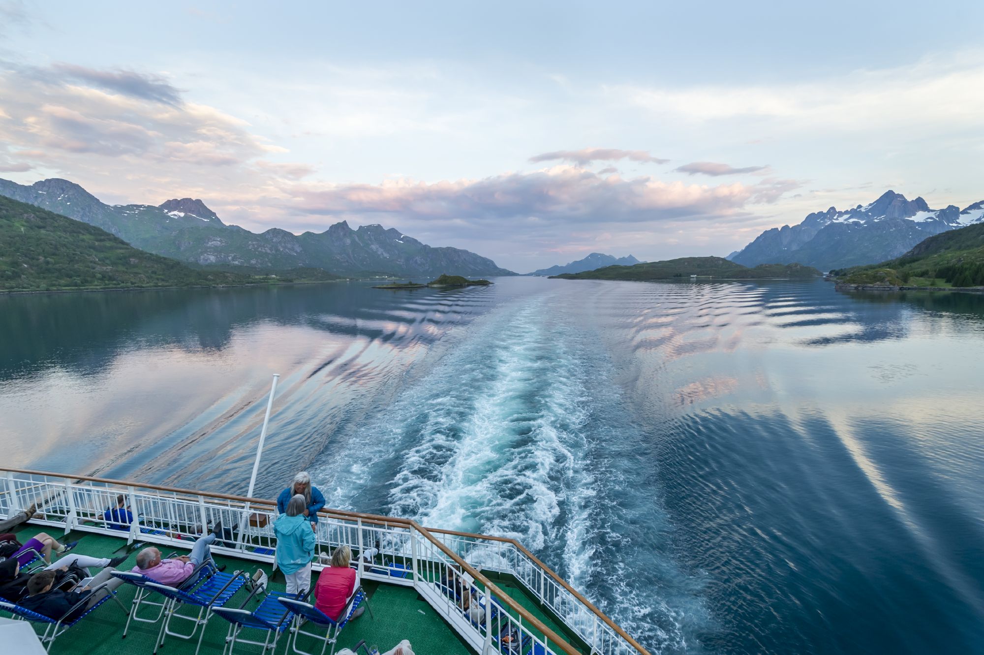 Brønnøysund - Svolvær. I dag krydser vi Polarcirklen tidligt om morgenen. Nu er her mulighed for at opleve midnatssol om sommeren og nordlys om vinteren. Mod Bodø, passerer vi den gamle handelsby Ørnes, hvor Norges næststørste gletsjer, Svartisen ligger. Turen går videre langs den spektakulære Helgelandskyst til Bodø. Ved Bodø kan du tage på en RIB-safari til verdens stærkeste malstrøm Saltstraumen. Skibet fortsætter videre mod Lofoten, over Vestfjorden og i horisonten kan ses de op til 800 meter høje stejle fjelde kaldet Lofotveggen. Ved Lofoten lægges der til ved Stamsund og Svolvær. Før natten falder på, sejles igennem det smalle Raftsund.