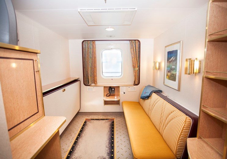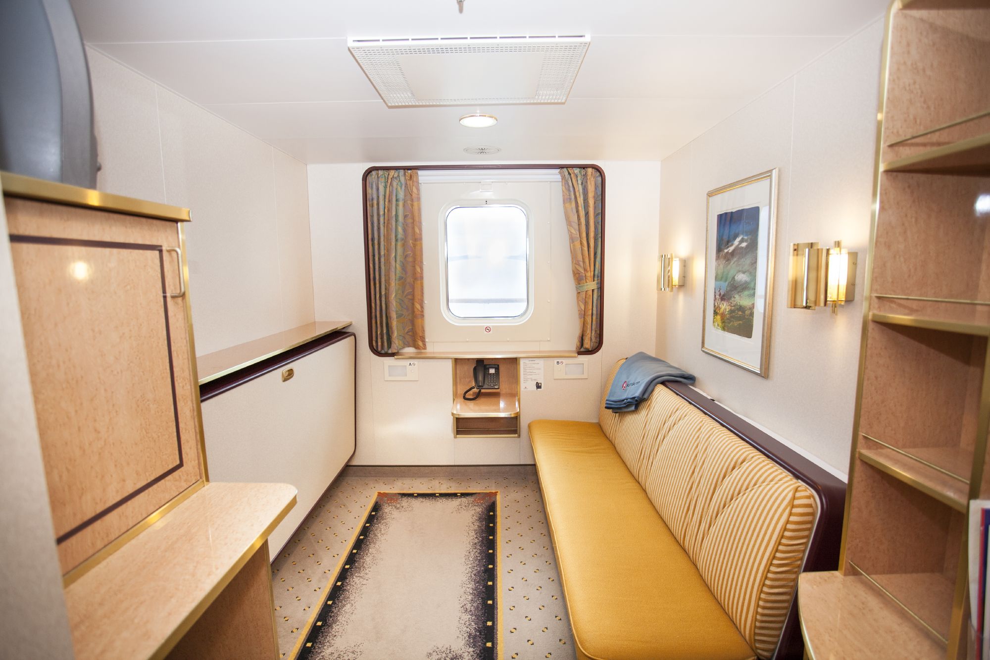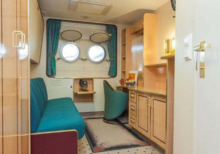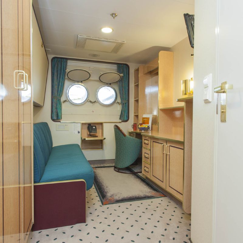 De mest eksklusive kahytter på skibet. Disse komfortable suiter ligger på øvre dæk og har bl.a. siddegruppe, TV. Badeværelse med brus/toilet. De fleste med dobbeltsenge. I alle suiter er der badekåbe, tøfler og lækre badeprodukter