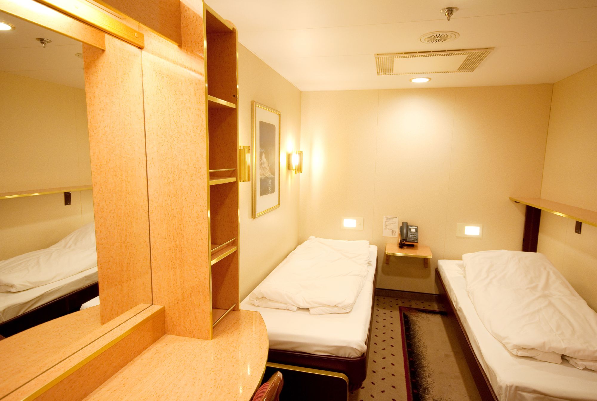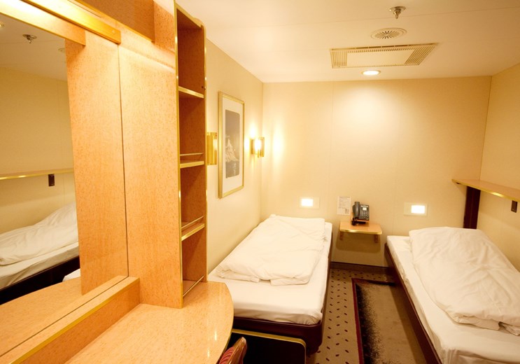 Disse kahytter ligger med nedre dæk og har en hyggelig atmosfære. Alle med badeværelse med brus/toilet. De fleste med separate senge, hvor en kan ændres til sofa. Enkelte har over- og underkøje. Nogen kahytter har flere faciliteter end andre