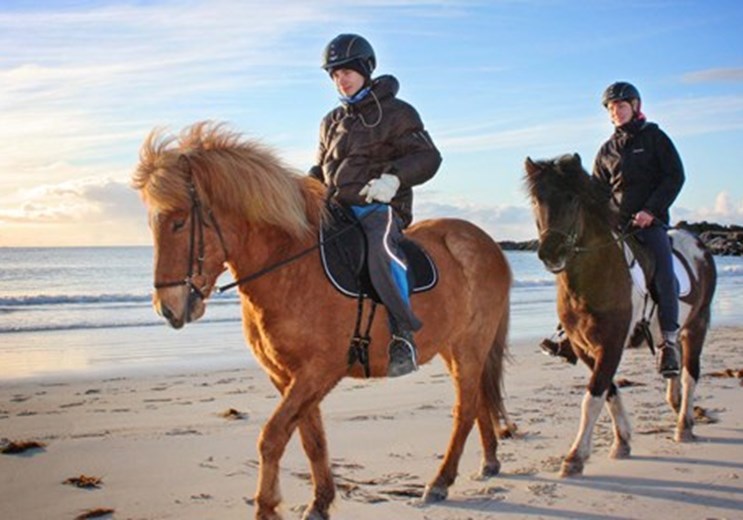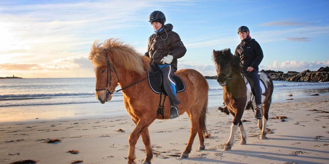 Ridetur på islandske heste gennem Lofotens storslåede natur. Turen er en stor naturoplevelse for både begyndere og erfarne ryttere. Vi hentes tidligt om aftenen på havnen i Svolvær og kører til Hov Hestegård i Gimsøy.