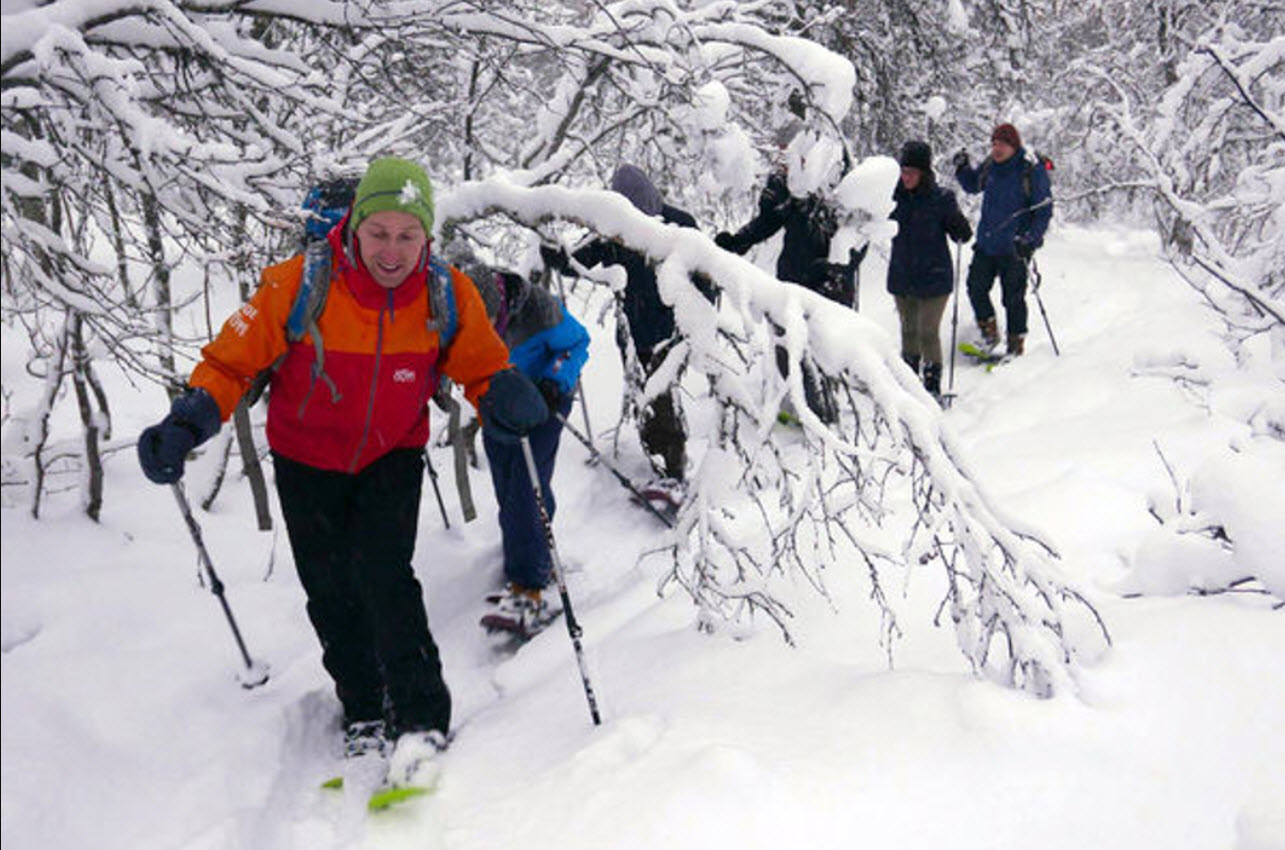 Efter en kort bustur gennem det smukke vinterlandskab omgivet af birke- og granskove når vi til toppen af Tromsøya. Vi spænder de moderne snesko på og begiver os ud i sneen. Træk vejret i den sprøde luft og oplev Norges frosne vinterlandskab som de lokale.