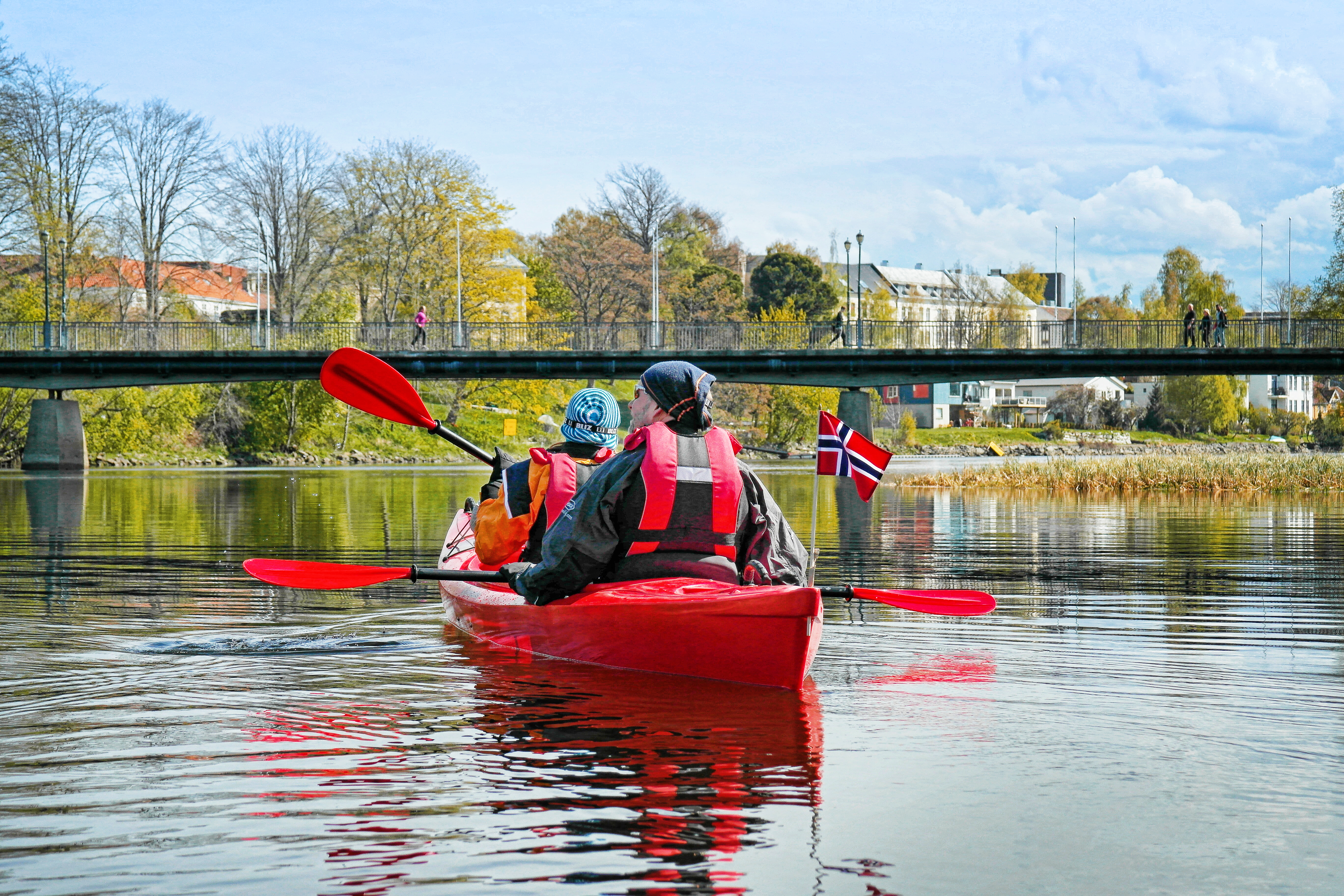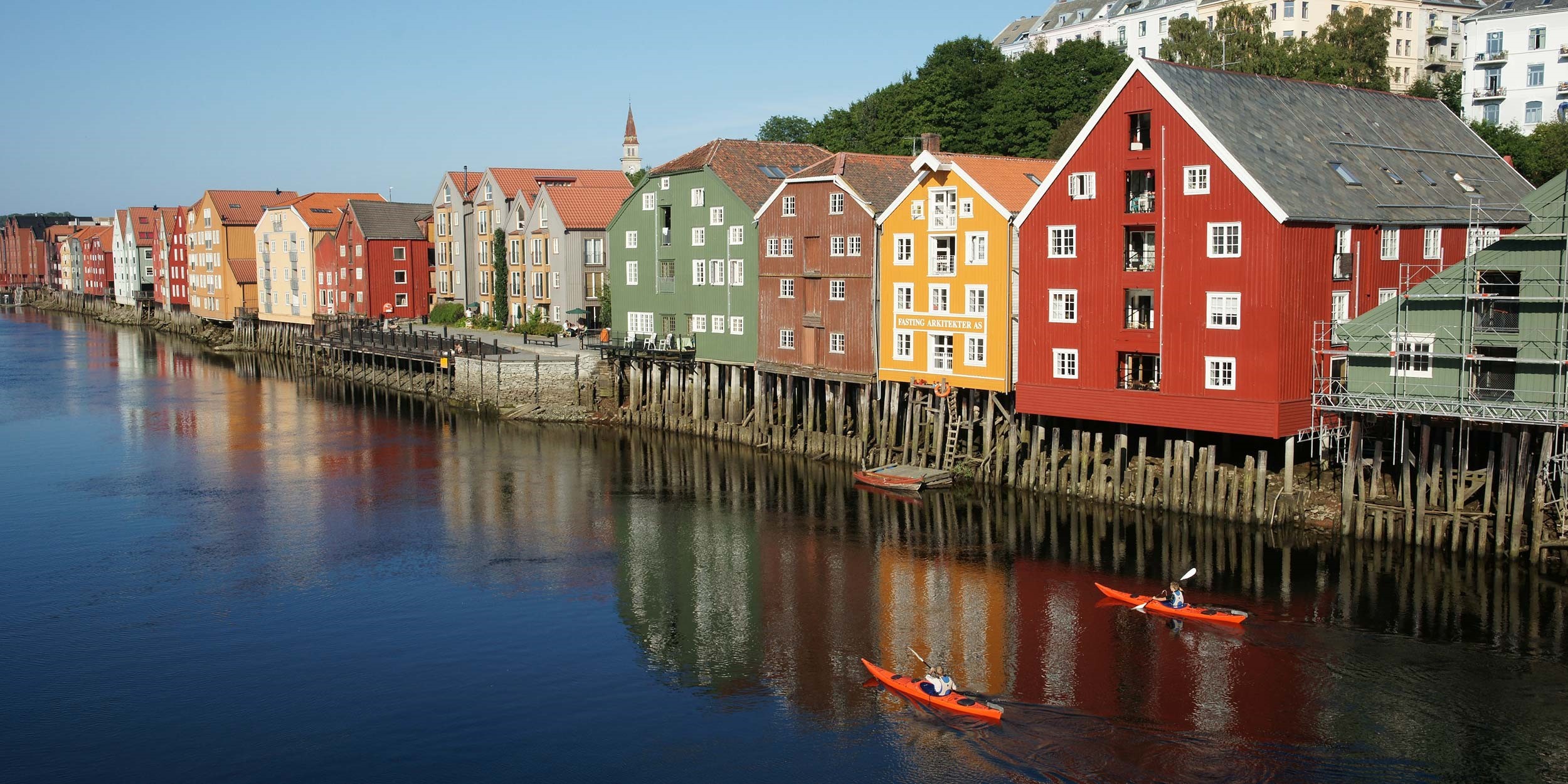NIVEAU 4. Har får du Trondheim fra en anden side, når du padler langs Nidelven og ind i kanalerne i byen. En kajaktur i historiske omgivelser og med store naturoplevelser. På en padletur med kajak op af elven får du et anderledes og spændende indtryk af hvad Trondheim har at byde på. De farverige træhuse nede ved havnen, Nidarosdomen, Kristiansten fæstning og den smukke park Marinen, er nogle av tingene du kan se på vej langs elven.