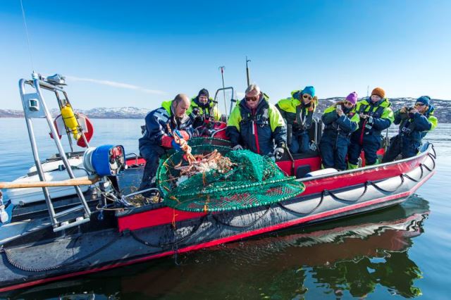 NIVEAU 3. Tag med på en fantastisk tur med RIB-både ud på havet, hvor du vil se hvordan man fanger og tilbereder kongekrabber og så skal du spise og nyde disse kæmper. En erfaren fisker tager med, og vi sejler langs Bugøyfjorden for at finde det rette sted at lægge ankre. Du får hjælp til trække krabberne op fra dybet. Guiden tager os derefter med til en lille hytte ved fjorden, hvor krabberne tilberedes og serveres. UHM! Du kan spise så mange krabber du vil! (Dag 7 udflugter kan ikke kombineres)