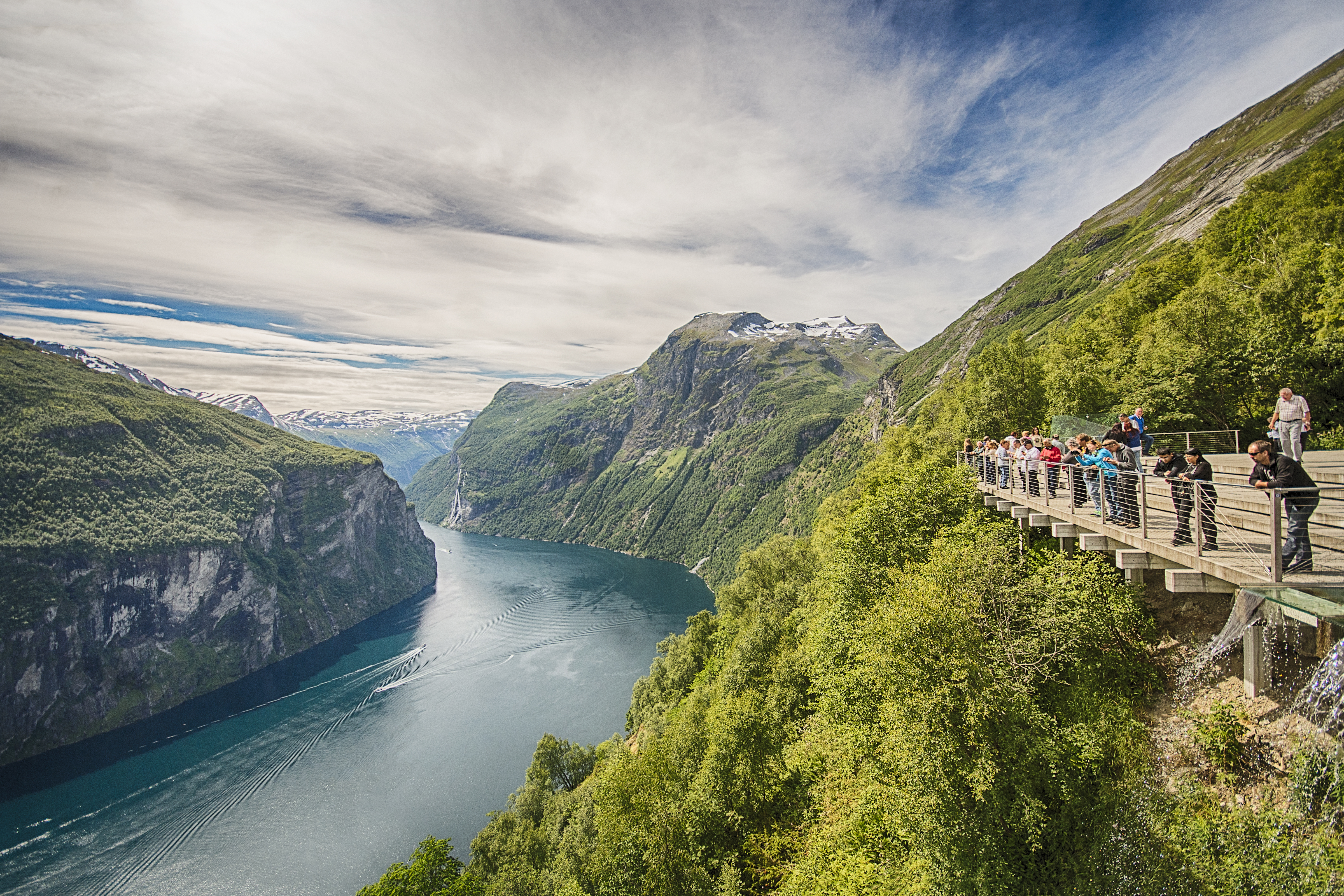 En hel dag med Geirangerfjordens skønhed! Geiranger Fjord er omgivet af snedækkede tinder, overdådige vandfald og en frodig og skiftende vegetation. Området er kåret af National Geographic som verdens mest uberørte rejsemål. Turen starter med en køretur op ad den stejle Ørneveien. Fra toppen er der en storslået udsigt over fjorden.