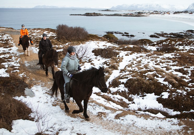 Ridetur på islandske heste gennem Lofotens storslåede natur. Turen er en stor naturoplevelse for både begyndere og erfarne ryttere. Vi hentes tidligt om aftenen på havnen i Svolvær og kører til Hov Hestegård i Gimsøy.