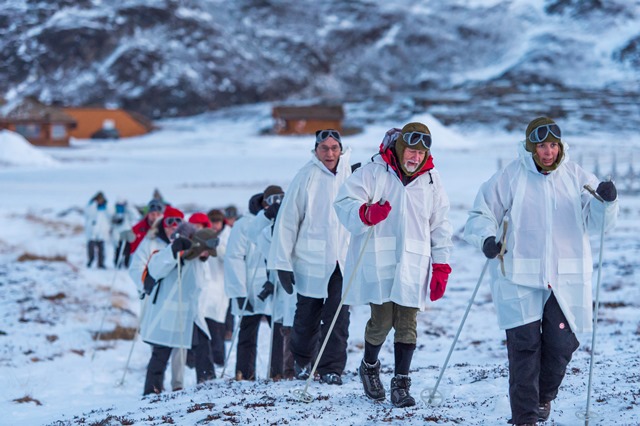 Her går vi en ekspedition til fods til toppen af Salenfjeldet. Her vil du virkelig føle, hvordan det er at færdes ude om vinteren i Arktis. Vi placerer flaget på toppen af Salen før vi returnerer. Vel nede i ”Framheim” serveres smagsprøver.