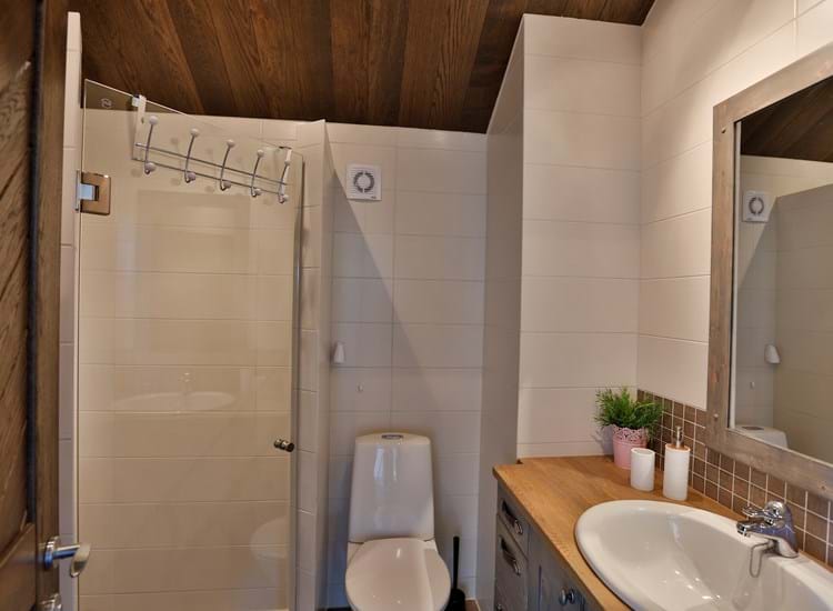 Hytte i 2 etager i stueetage: veludstyret køkken: komfur med ovn, køleskab med fryseskab, opvaskemaskine og mindre spisebord til 4. Stor stue med panoramavinduer, langbord pejs siddegruppe og solrig terrasse. Gratis Wi-Fi. 1 soverum med dobbeltseng. 1 badeværelse med brus, toilet og sauna.