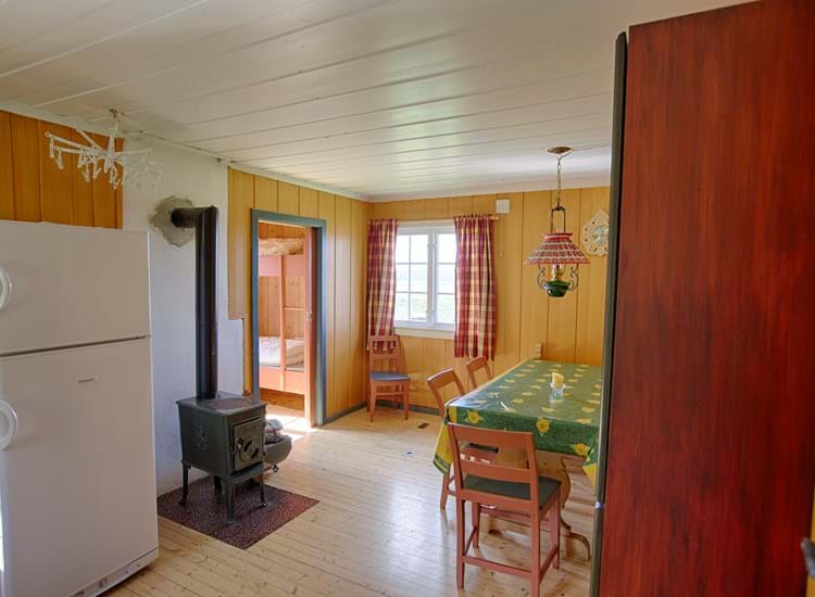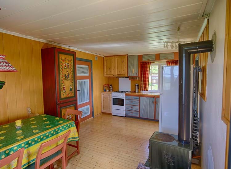 Hytte med solcellepaneler. I hytten er ikke indlagt vand, men drikkevand bringes af ejer. Køkkendeling: el-komfur med ovn, køleskab med fryseskab. Opholdsstue med spisebord, sofagruppe, pejs/brændeovn (brænde inkl.)