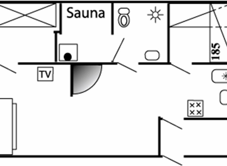 2 soverum: soverum 1: underkøje (85 cm bred) + overkøje (75 cm bred). Længde 200 cm. Soverum 2: 1 seng 210x90 cm + 1 seng 188x75 cm.