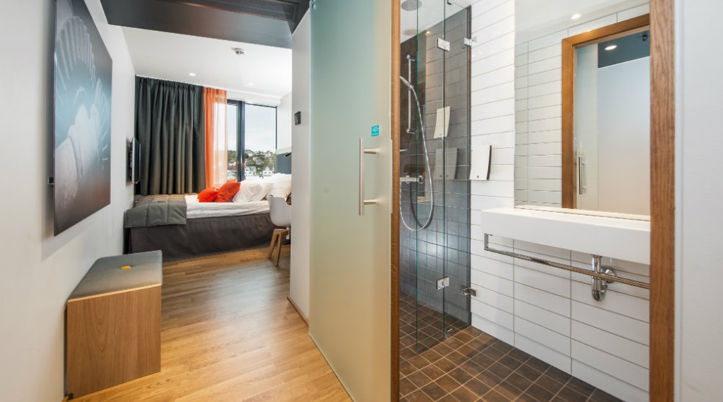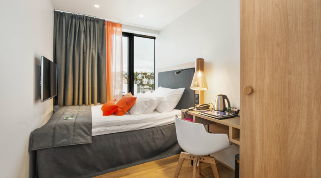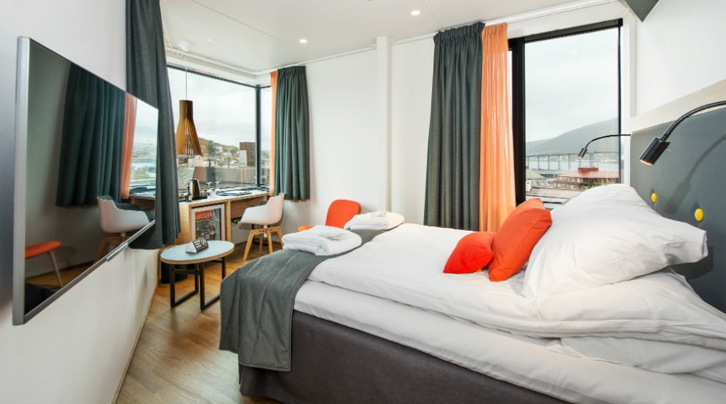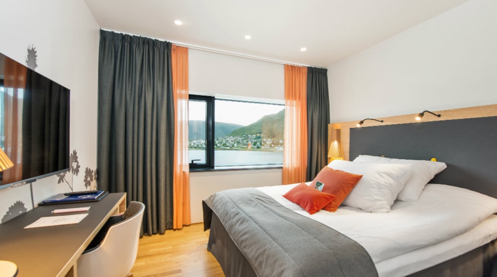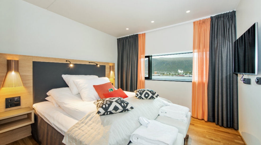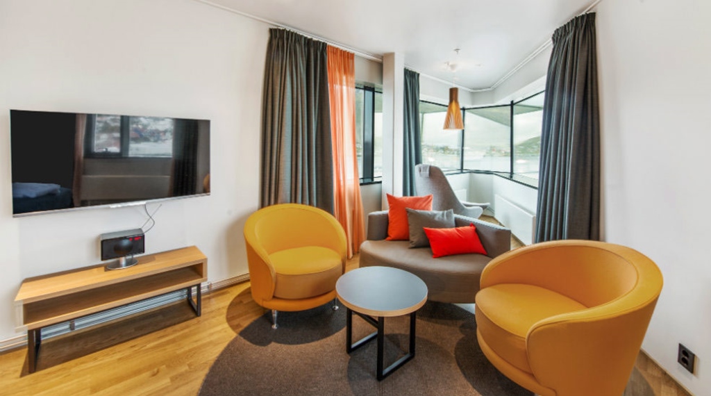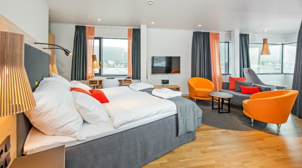 Juniorsuite: ca. 28 m2 Max 2-4 person. Rummelige og lyse suiter med god plads til 2 pers. Dobbeltseng 180 cm bred, siddegruppe og store badeværelser. Her er der badekåber, tøfler og lækre badeprodukter. Juniorsuiterne har en skøn havudsigt over Tromsøsundet. Der er mulighed for connectingroom.