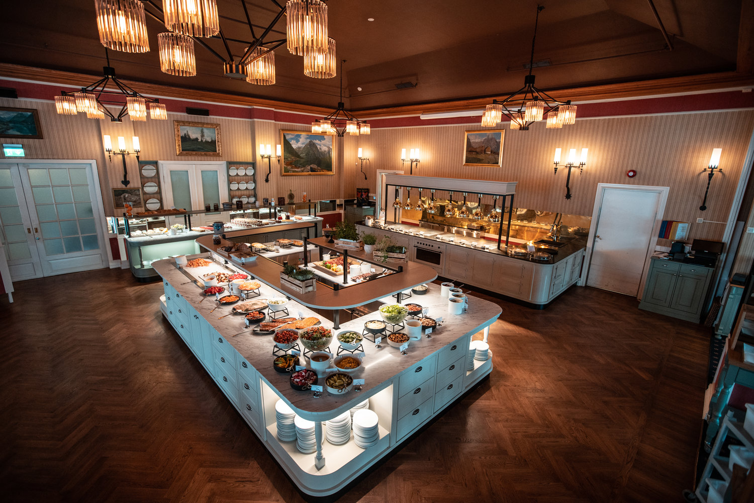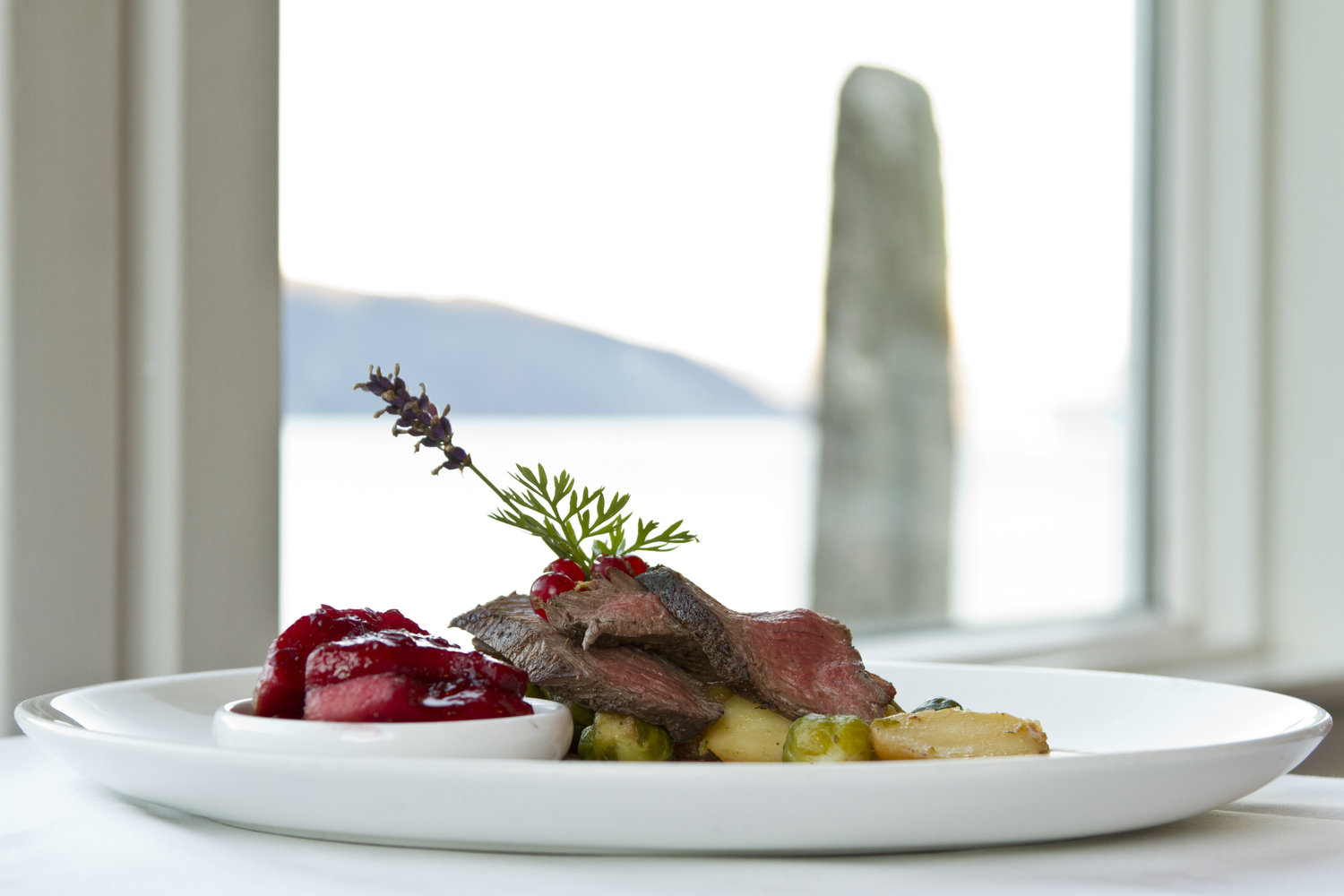 Den elegante restaurant med fjordudsigt serverer "kortreist mad", hvor maden tilberedes på både traditionel og international vis, hovmesteren supplerer vin fra den righoldige vinkælder.