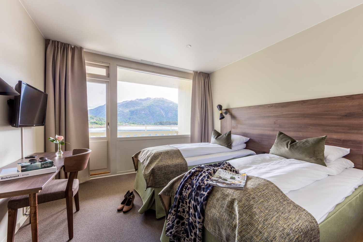 Twin værelserne er lidt mindre og har separate senge. Beliggende med øst og delvis udsigt til fjorden, Sognefjord Akvarum og Tjugum kirke.