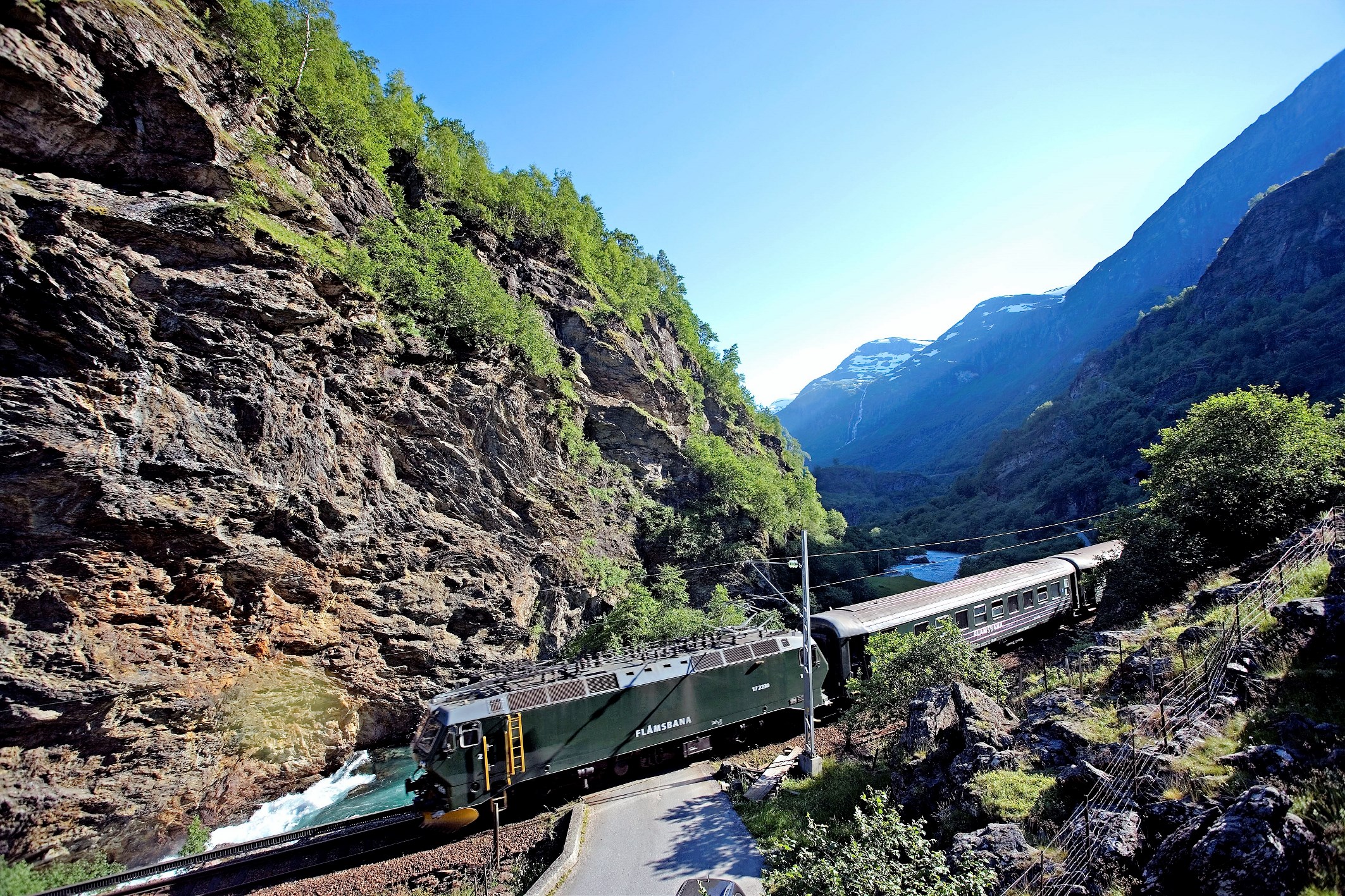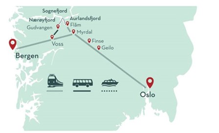 Med Flåmsbanen, en af verdens stejleste jernebanestrækninger og et mesterværk af norsk ingenørkunst. Den 20 km lange togtur er en spektakulær rejse med panoramaudsigter til de vildeste fjordlandskaber i verden. Strækningen har 20 tunnelser, 80% af strækningen har en 55% stigning. Når turen slutter i Myrdal byttes tog til Bergensbanen.