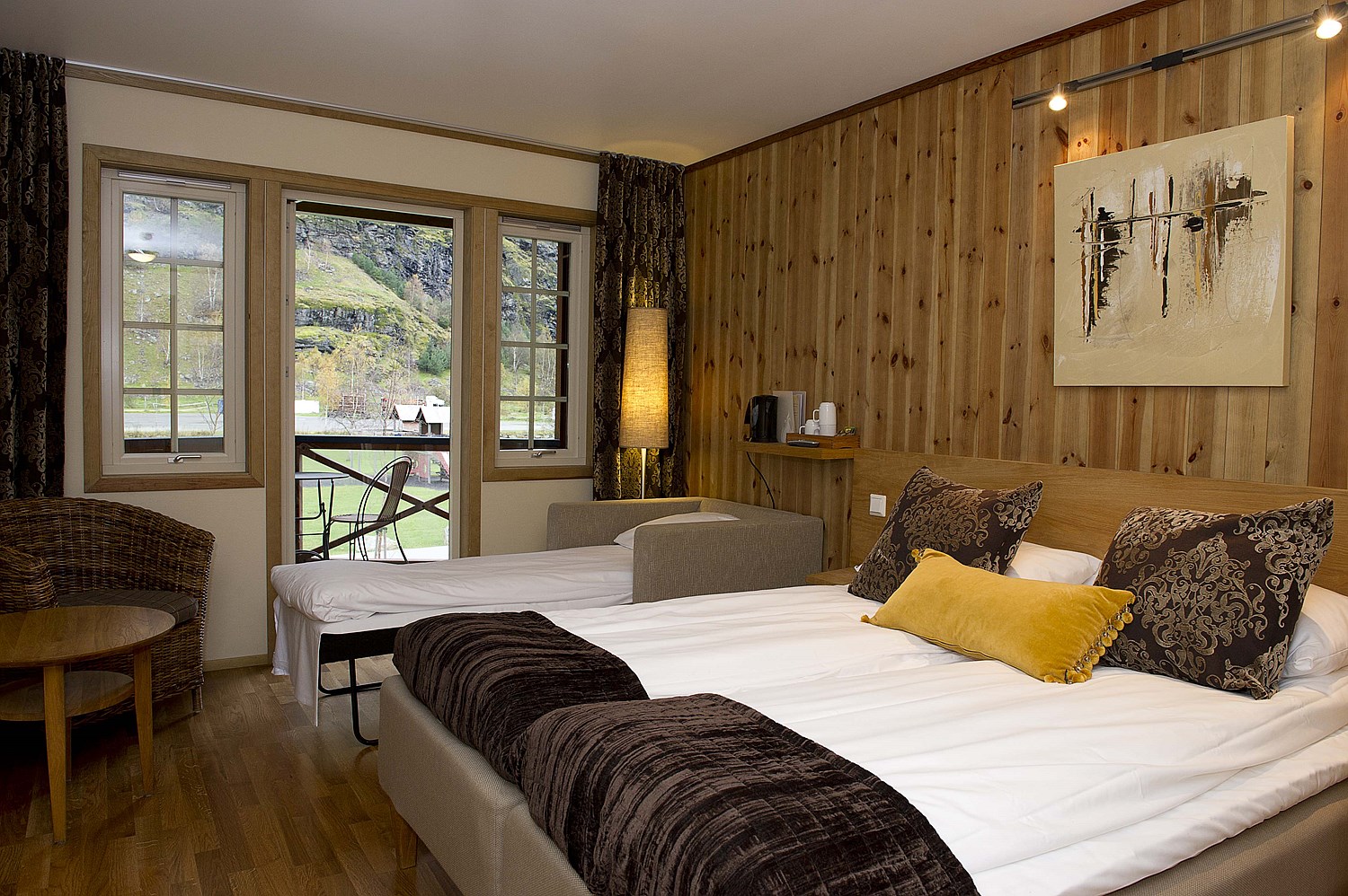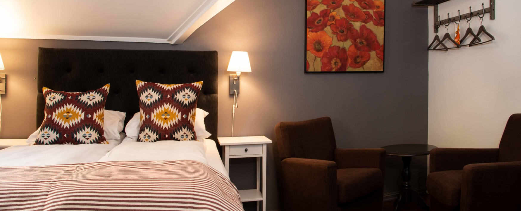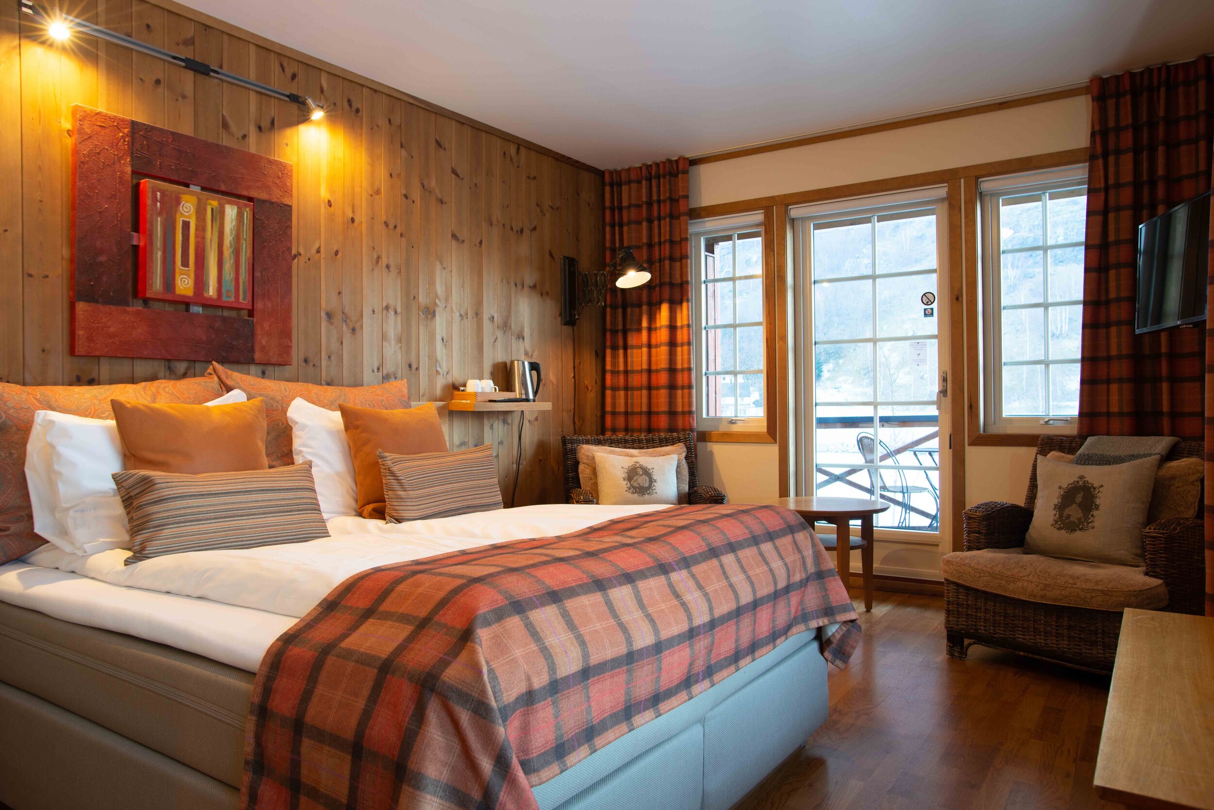 Hotelværelserne har en rustik stil med varme farver og moderne design.
