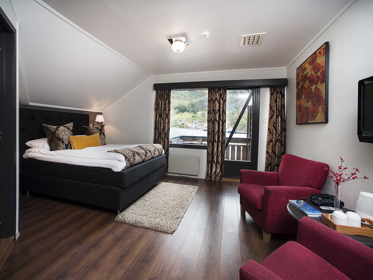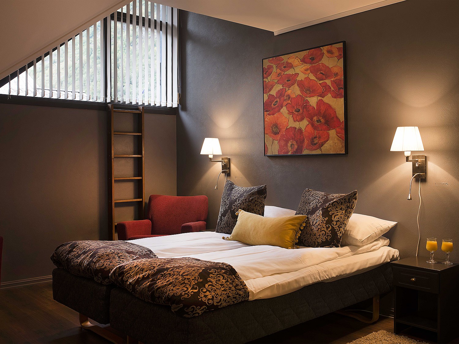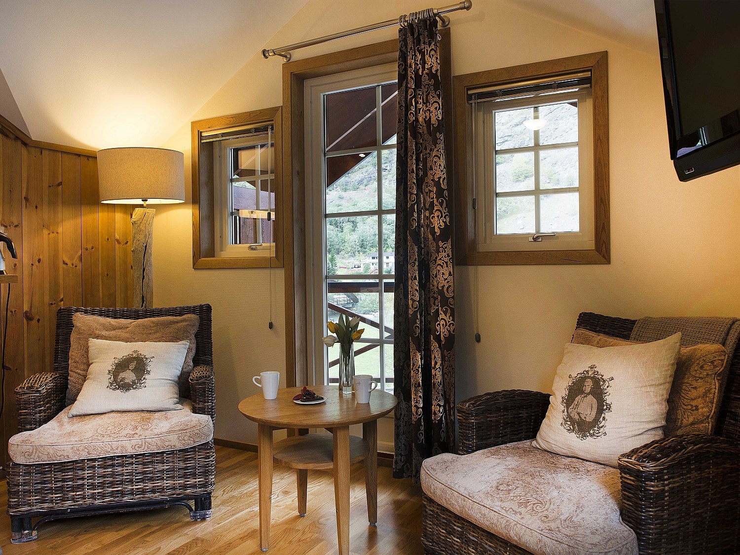 Hotelværelserne har en rustik stil med varme farver og moderne design.