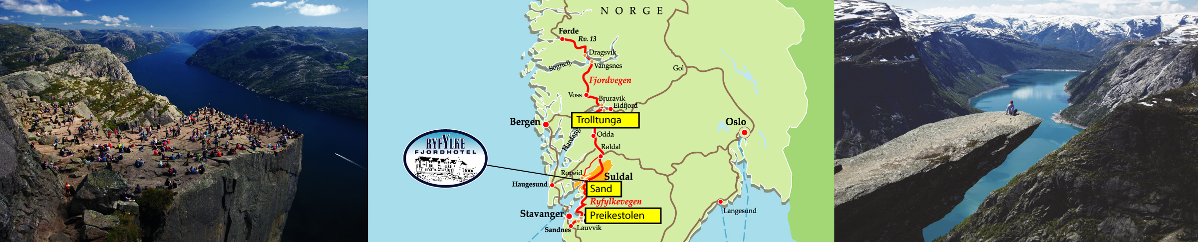Fjordhotellet er smukt beliggende ved Sandsfjord i den lille kystby Sand, omgivet at fjelde. Området et et af de smukkeste naturområder i Fjord-Norde og er kendt for bl.a. Preikestolen, Lysefjorden som kan nås i bil fra hotellet. Ryfylke Fjordhotel ligger smukt til fjord og fjeld. Overalt er den en hyggelig stemning både udenfor og indendørs i saloner og værelser.