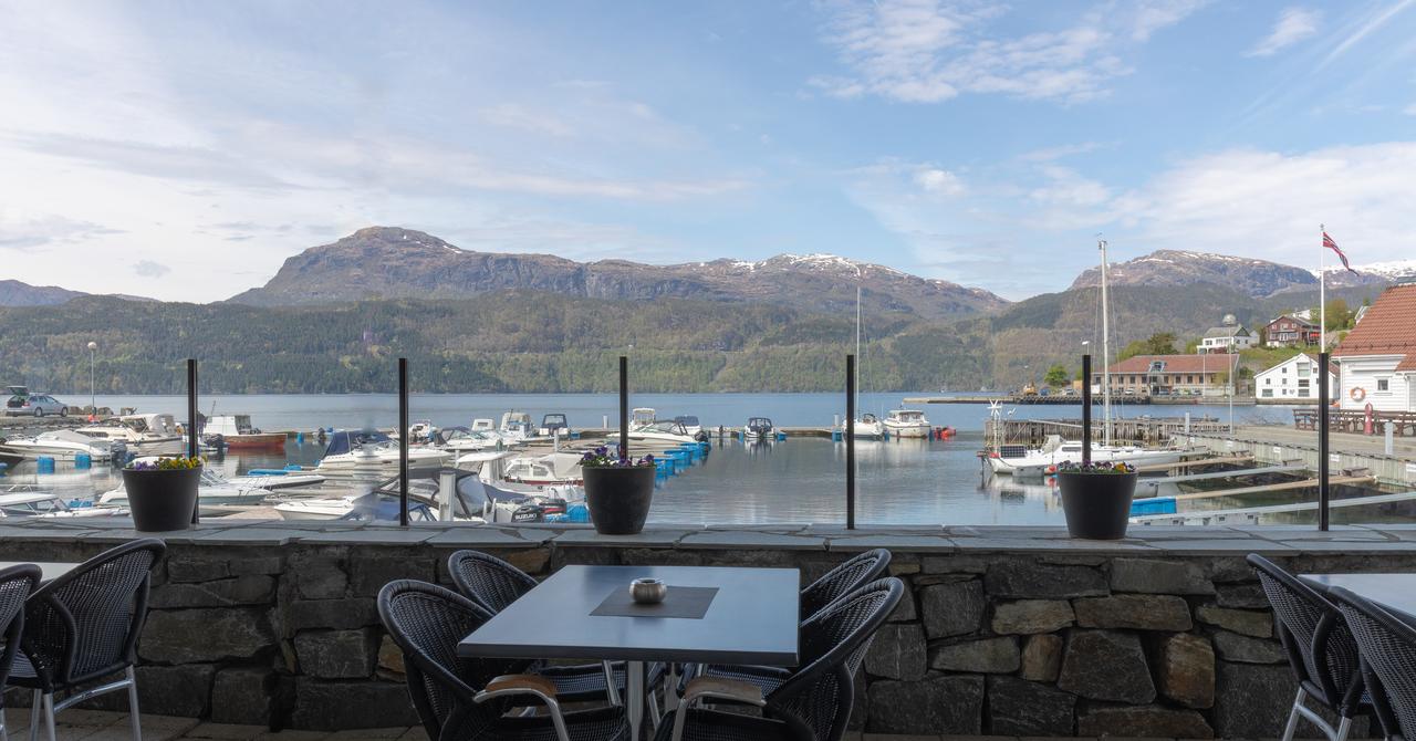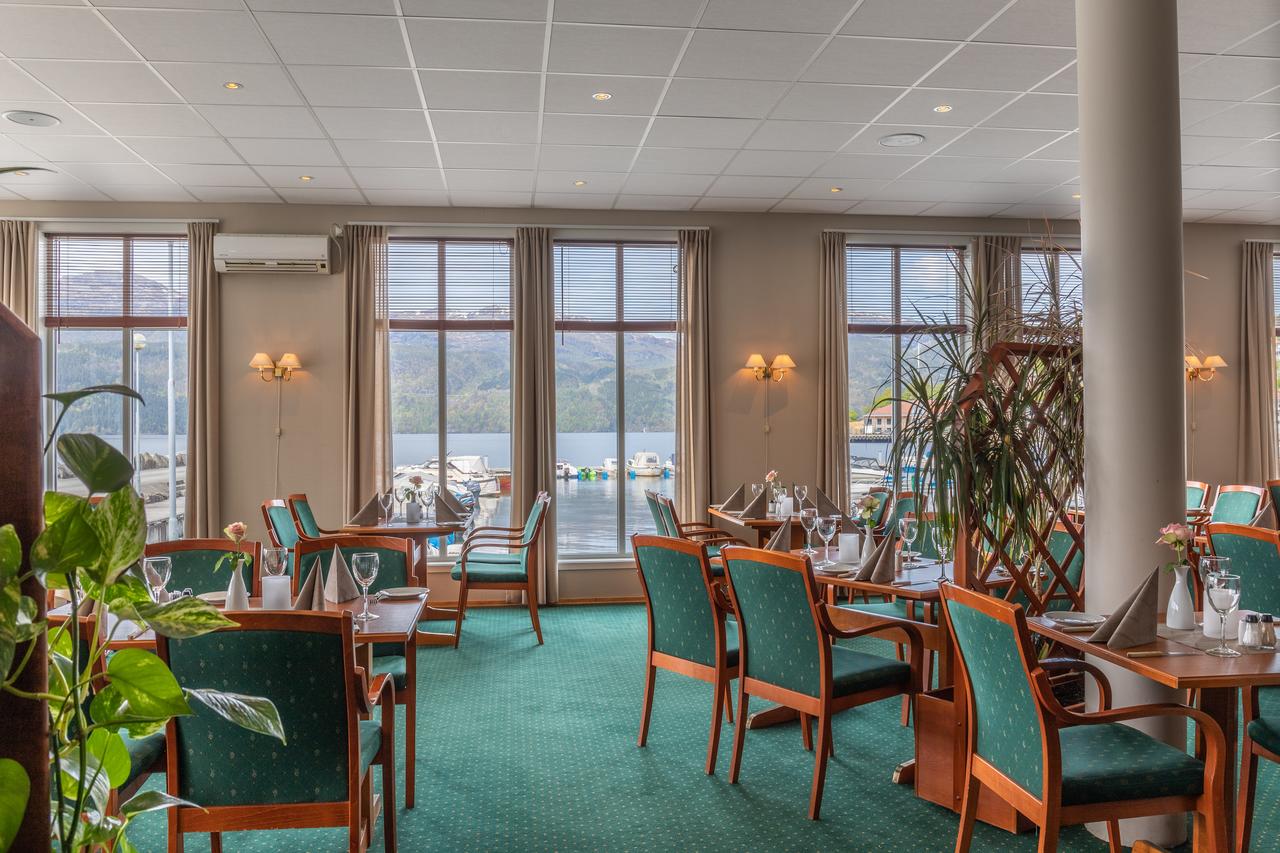 I hotellets restaurant kan du nyde et måltid mad med udsigt til fjord, fjeld, elv og lystbådehavn. her serveres á la carte menu, småretter, smørebrød og om sommeren buffet. Fra maj - sept. tilbydes udendørs servering på "Terrassen" eller "Promenaden" - perlen på Sand. Her sidder du helt i fjordkanten mens du kan nyde en forfriskning eller et måltid bad, men laksen hopper lige ved siden af. Er solen fremme er den her fra tidlig morgen til sen aften.