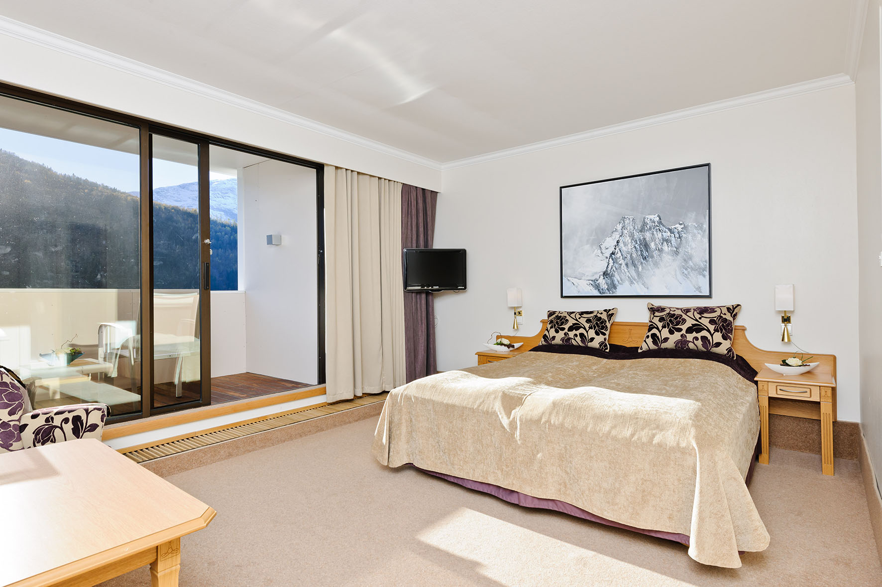 Standardværelser er 16-22 kvm og er fordelt på forskellige etager, 1.sal til 5.sal. Udsigt mod fjeld. Her er ikke mulighed for ekstraseng.