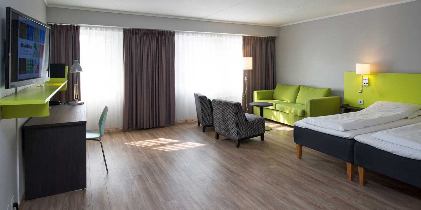 Er I flere end to, tilbydes der standardværelser med plads til 3 personer, opredning i ekstra seng eller sovesofa. Her findes også større familieværelser med et eller to soverum for indtil 4 personer, 30-40 kvm. Her er de ekstra sovepladser i køjeseng eller på sovesofa. Familieværelser har en siddegruppe, samt et lille køkkenhjørne og spisebord.